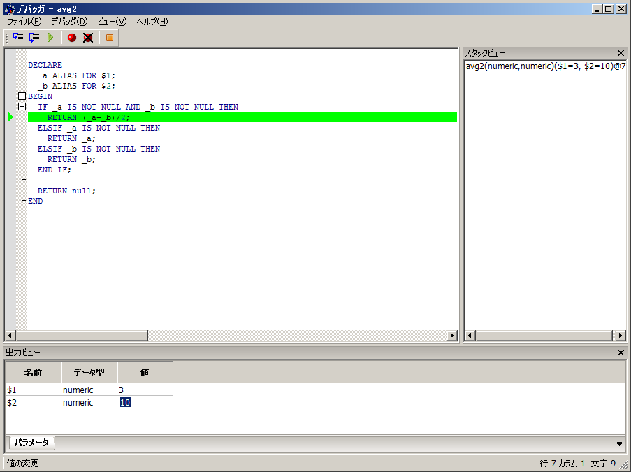 今回は、以下のような「2つの値を引数として与えて、両方がNULLでなければその平均を計算し、片方がNULLであれば有効な値を返却するavg2関数」をデバッガを介して実行してみます。